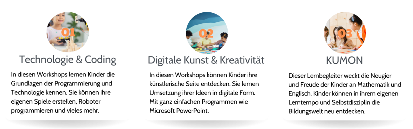 Unsere sorgfältig kreierten Workshops wurden mit dem Ziel konzipiert, eine lehrreiche und dennoch unterhaltsame Umgebung zu schaffen, in der Kinder ihre Interessen verfolgen und neue Fähigkeiten entwickeln können.